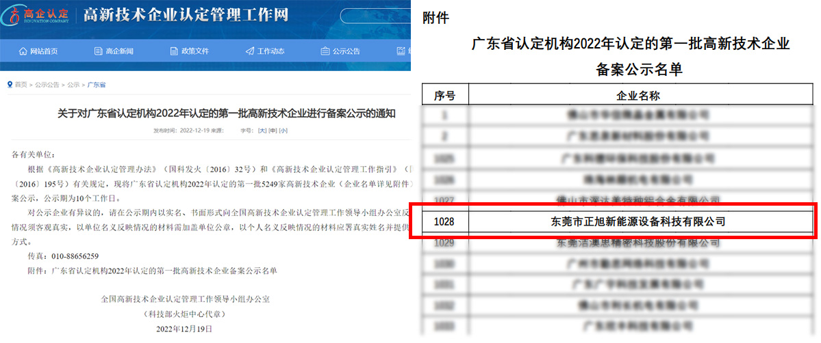 近日,關于對廣東省認定機構2022年認定的第一批高新技術企業(yè)名單公示,經過嚴格篩選和評審,東莞市正旭新能源設備科技有限公司成功入圍,正旭已連續(xù)四次十年成功通過認定為國家高新技術企業(yè)。這是繼正旭成功入圍廣東工信廳2022創(chuàng)新型中小企業(yè)名單公示...
