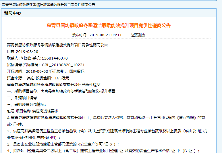 【公告】2019年高青縣唐坊鎮(zhèn)政府冬季清潔取暖能效提升項目