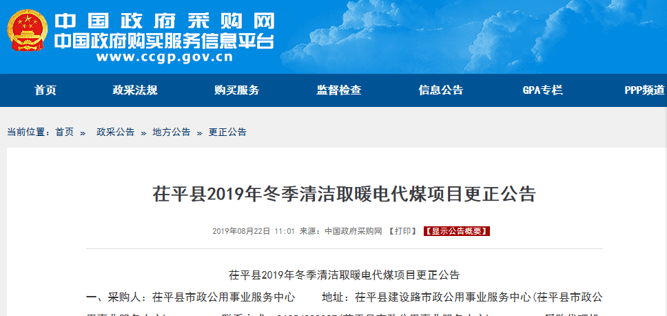 【更正公告】茌平縣2019年冬季清潔取暖電代煤項目