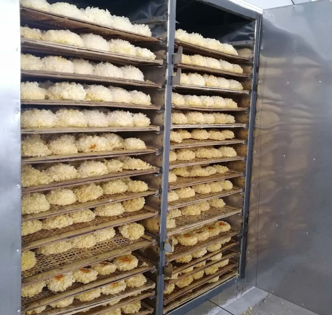 益源食用菌有限公司作為古田縣優(yōu)秀企業(yè)之一,旗下主要產(chǎn)品銀耳干燥加工技術(shù)采用正旭熱泵烘干機(jī)組,銀耳烘干加工流程一般分為清水浸泡—挑選—瀝水—烘干—包裝。采摘下來的銀耳先用清水浸泡,銀耳會發(fā)漲飽滿,再挑選出有黑點或腐爛的次品。平均分層裝架,自然瀝水一個小時再推進(jìn)烘干房烘干。烤箱溫度控制在60-80度,熱風(fēng)由風(fēng)機(jī)直接吹送到物料表面,確保每層銀耳均勻的通風(fēng)受熱。前四個小時濕度非常大,排出的高濕高溫空氣不進(jìn)行循環(huán),及時的排濕能保證銀耳不變質(zhì)不變色。后四個小時烤箱溫度控制在70度以上,烘干到銀耳可捏碎。由于銀耳吸水型比較好,烘干的銀耳要使用包裝袋打包,放于除濕房或冷庫存放。