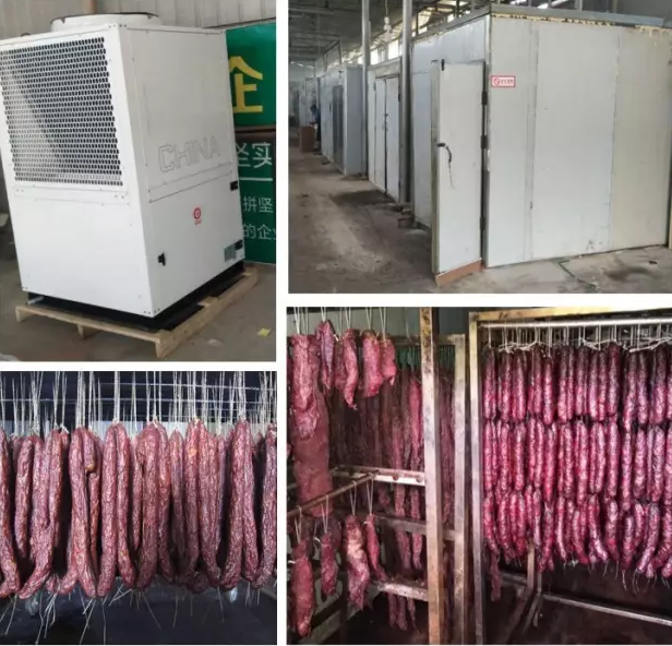 歷時(shí)5-6個(gè)小時(shí),在物料裝進(jìn)烤房后二小時(shí)內(nèi)溫度快速升到65℃,不用怕濕,目的是使新鮮的臘腸在2小時(shí)內(nèi)達(dá)到內(nèi)外溫度一致,升溫的過(guò)程也是調(diào)味料和肉一個(gè)發(fā)酵的過(guò)程,可以控制肉不變色,不變味,預(yù)熱時(shí)間后,調(diào)節(jié)溫度至45-50℃,溫度在50-55℃范圍內(nèi),濕熱空氣由排濕口自動(dòng)排出,熱泵回收熱量,這一階段表面水分已被蒸發(fā),色澤從進(jìn)料的灰白色轉(zhuǎn)為淺紅色,此階段為轉(zhuǎn)色期。