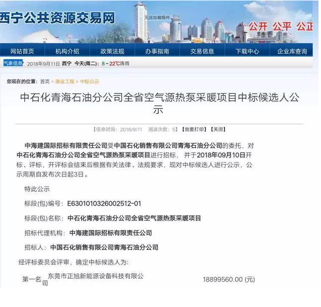 近日,中石化青海石油分公司全省空氣源熱泵采暖項(xiàng)目中標(biāo)名單出爐,正旭空氣能成功中標(biāo)。中國石化銷售有限公司青海石油分公司作為招標(biāo)人委托中海建國際招標(biāo)機(jī)構(gòu)進(jìn)行了嚴(yán)謹(jǐn)招標(biāo)工作,眾多熱泵企業(yè)同標(biāo)競爭,正旭空氣能成為三家中標(biāo)企業(yè)的第一名。