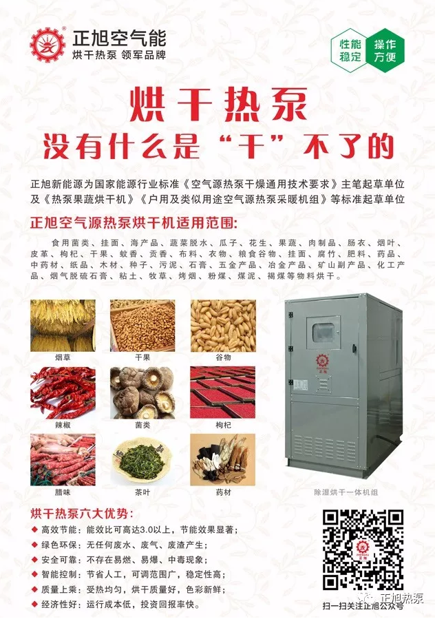 7、適用范圍廣,不受氣候影響:空氣能熱泵烘干機(jī)可廣泛適用于煙草、污泥、海產(chǎn)品、臘制品、果蔬、醫(yī)藥、紙品、皮革、木材等行業(yè)的加熱烘干作業(yè)。