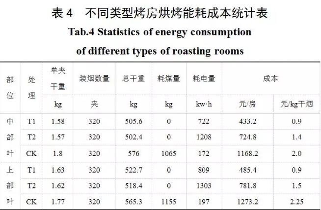 從表4可知,各處理烘烤能耗成本相比,T1能耗成本最低,中部葉和上部葉每千克干煙的成本均為0.9元;對照CK能耗成本最高,由煤和電兩種能源構(gòu)成,中部葉和上部葉每千克干煙的成本分別為2.0元和2.25元;T2能耗成本居中,中部葉和上部葉每千克干煙的成本分別為1.4元和1.5元。以上結(jié)果表明,T1處理的烤房具有明顯的節(jié)能效果,比對照CK烤房可節(jié)省1.1-1.35元/kg干煙。