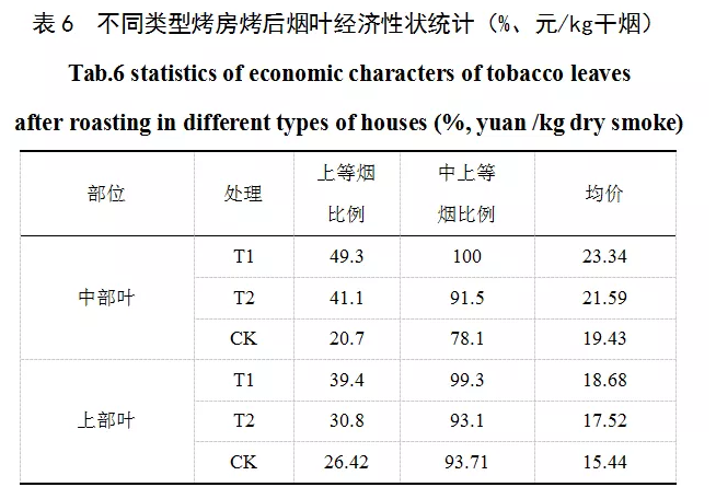 從表5可知,不同處理烘烤用工成本以對照CK最高,為112.5元/房;以處理T1最低,為31.25元/房;處理T2居中,為36.25元。分析比較用工構(gòu)成,可明顯看出,處理T1和T2與對照CK相比,技術(shù)指導(dǎo)用工相差不大;處理T1和T2比對照CK缺少了加煤用工環(huán)節(jié),而加煤用工在對照CK總用工量中占有較大比例,因此導(dǎo)致總用工量和成本明顯降低,其中用工成本比對照CK減少了76.25-81.25元/房。處理T2烘烤時(shí)間比處理T1長1天,所以用工成本相對較高。