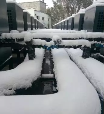 事實勝于雄辯,讓我們通過真實案例來一探究竟。新疆遠(yuǎn)離海洋,深居內(nèi)陸,最冷月(1月),平均氣溫在準(zhǔn)噶爾盆地為零下20℃以下,該盆地北緣的富蘊(yùn)縣絕對最低氣溫曾達(dá)到零下50.15℃,是全國最冷的地區(qū)之一。而下面這組照片,就是在遙遠(yuǎn)的新疆拍攝的。該項目為新源縣聯(lián)誠生態(tài)大酒店有限公司的空氣能熱泵采暖工程項目,采用了正旭的空氣源熱泵來為提供暖氣。