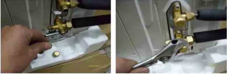 4、 從大閥門上將加氟口處螺帽擰下,加氟管擰到加氟口上,并確認(rèn)頂針是否頂?shù)轿弧#ń故褂勉Q子等工具擰緊接頭。)