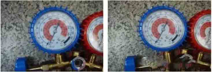10、 確認(rèn)無漏點(diǎn)后打開小閥門閥芯,當(dāng)壓力(低壓)達(dá)到0.1 MPa-0.5 MPa時(shí)關(guān)掉小閥門。如此時(shí)壓力表指針不動(dòng),則需少量打開壓力表表閥,看是否有氣體排出,如無氣體排出則說明加氟管與空調(diào)閥門連接不到位,加氟管的頂針未頂開閥門的頂芯。此時(shí)應(yīng)重新進(jìn)行抽真空操作(從第四步開始)。
