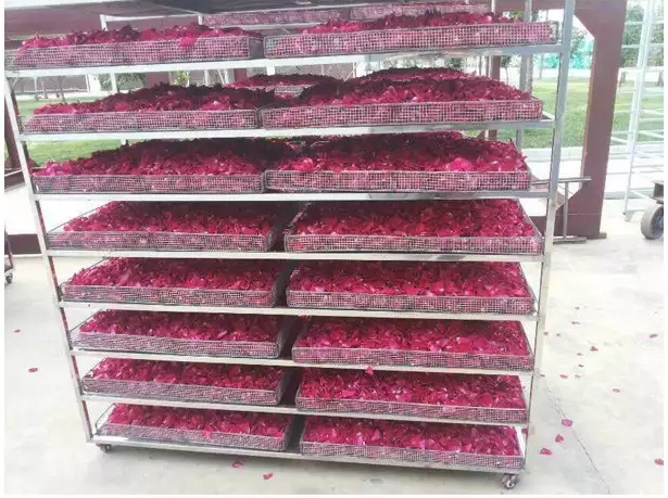 目前,玫瑰花、菊花等多種鮮花的烘干,經(jīng)過多次風道設(shè)計、排濕程度控制的調(diào)試,很多烘干廠家已經(jīng)有著成熟的空氣能烘干方案,能夠保證其烘干前的模樣。在如玫瑰花,在烘干后保持原有的鮮艷紅色,用鼻子一聞還帶有獨特的玫瑰花香味。