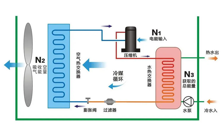 如此往返重復(fù),使制冷劑不斷吸收空氣中的熱量再釋放到水或烘干房內(nèi),實現(xiàn)熱量的轉(zhuǎn)移。從中我們可以發(fā)現(xiàn),與電熱設(shè)備直接用電加熱不同,空氣源熱泵雖然也要用到電,但電只是用來驅(qū)動壓縮機做功、促進制冷劑轉(zhuǎn)化成高溫高壓的氣體,達到類似“四兩撥千斤”的作用,真正實現(xiàn)“一度電當(dāng)三度電使用”。