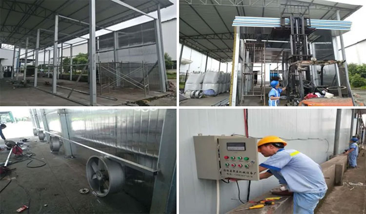烘干房建造步驟大致可分類(lèi):安裝底板 →安裝立板→安裝頂板→安裝底板加強(qiáng)板(方便工人使用推車(chē)作業(yè)和烘房衛(wèi)生的打掃)→安裝主機(jī)→安裝循環(huán)風(fēng)機(jī)→安裝風(fēng)道板或勻風(fēng)板→連接電源線和排水管。