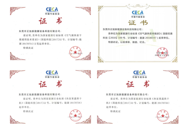 憑借著卓越的技術(shù)優(yōu)勢,正旭不僅參與國家標(biāo)準(zhǔn)《金銀花空氣源熱泵干燥通用技術(shù)要求》起草制定,還是國家能源行業(yè)標(biāo)準(zhǔn)《空氣源熱泵干燥機組通用技術(shù)規(guī)范》主筆起草單位,參與《空氣源熱泵烤煙烤房》、《空氣源熱泵果蔬烘干機》、《空氣源熱泵糧食干燥機》、《空氣源熱泵烤煙房煙葉調(diào)制技術(shù)規(guī)程》、《空氣源熱泵中藥材烘干技術(shù)通則》、《空氣源熱泵污泥干化機》等十多項標(biāo)準(zhǔn)已頒布實施,擁有多項重量級發(fā)明專利,連年榮獲《中國熱泵行業(yè)十大優(yōu)秀工農(nóng)業(yè)烘干品牌》稱號,并進入全國多省市地區(qū)農(nóng)機購置補貼目錄。正旭積極參與鄉(xiāng)村振興,提升農(nóng)產(chǎn)品烘干技術(shù),共同助力碳達峰、碳中和,實現(xiàn)“雙碳”目標(biāo)!