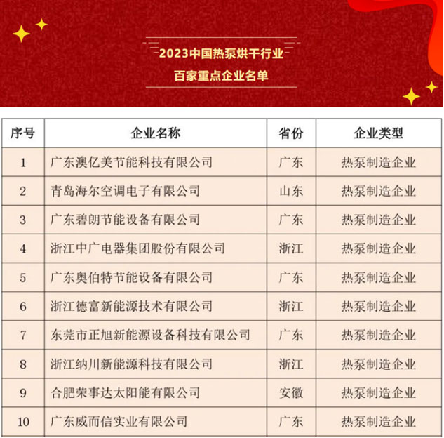 會(huì)上,由中國節(jié)能協(xié)會(huì)熱泵專業(yè)委員會(huì)支持、《熱泵》雜志承辦“2023中國熱泵烘干行業(yè)百家重點(diǎn)企業(yè)推選活動(dòng)”,來自權(quán)威科研院所、知名院校、檢測認(rèn)證機(jī)構(gòu)、標(biāo)準(zhǔn)制定組織、行業(yè)協(xié)會(huì)等部門的專家組成評(píng)審組評(píng)審,對(duì)外發(fā)布了《2023中國熱泵烘干行業(yè)百家重點(diǎn)企業(yè)》榜單。60家熱泵制造廠家、23家烘干系統(tǒng)集成商、17家配件配套企業(yè)上榜,正旭空氣能榜上有名。《2023中國熱泵烘干行業(yè)百家重點(diǎn)企業(yè)》榜單的發(fā)布,將為廣大烘干品牌商與用戶之間搭建溝通橋梁,塑造烘干產(chǎn)業(yè)企業(yè)新形象,構(gòu)建熱泵烘干品牌新秩序。