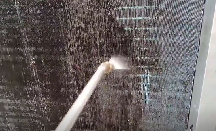 接下來,對于熱泵蒸發(fā)器翅片上較重的塵垢污物,可使用細軟毛刷或者用電動吸塵器清除一遍,吸塵器可有效清除翅片上粘染并難以清洗絮狀物、灰塵等,然后再用高壓水槍進一步?jīng)_洗翅片表面灰塵。之后再用噴頭式清潔劑,順著翅片的方向從上往下清洗,從左到右來回均勻噴射至蒸發(fā)器的翅片上,保證清潔泡沫完全將蒸發(fā)器表面覆蓋。