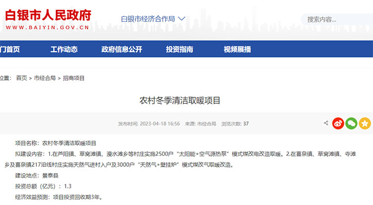 據(jù)悉,今年上半年白銀市下屬景泰縣發(fā)布了一項(xiàng)總投資額達(dá)1.3億元的農(nóng)村冬季取暖項(xiàng)目,項(xiàng)目涵蓋蘆陽鎮(zhèn)、草窩灘鎮(zhèn)、漫水灘鄉(xiāng)等村莊實(shí)施2500戶“太陽能+空氣源熱泵”模式煤改電改造取暖及喜泉鎮(zhèn)、草窩灘鎮(zhèn)、寺灘鄉(xiāng)及喜泉鎮(zhèn)217沿線村莊實(shí)施天然氣進(jìn)村入戶及3000戶“天然氣+壁掛爐”模式煤改氣取暖改造。