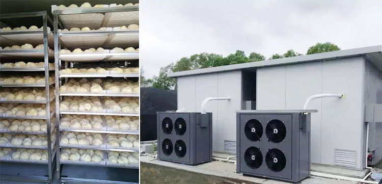 以正旭在哈爾濱某猴頭菇基地烘干項目為例,該項目共有8個烤房,共安裝了8臺15P正旭分體式空氣源熱泵烘干機(jī)。設(shè)計每個烘烤房最高溫度70℃,每次烘干3000公斤,除水量60%,烘干時間60個小時。項目自2016年完工以來,七年間一直穩(wěn)定運行,得到客戶的積極認(rèn)同。