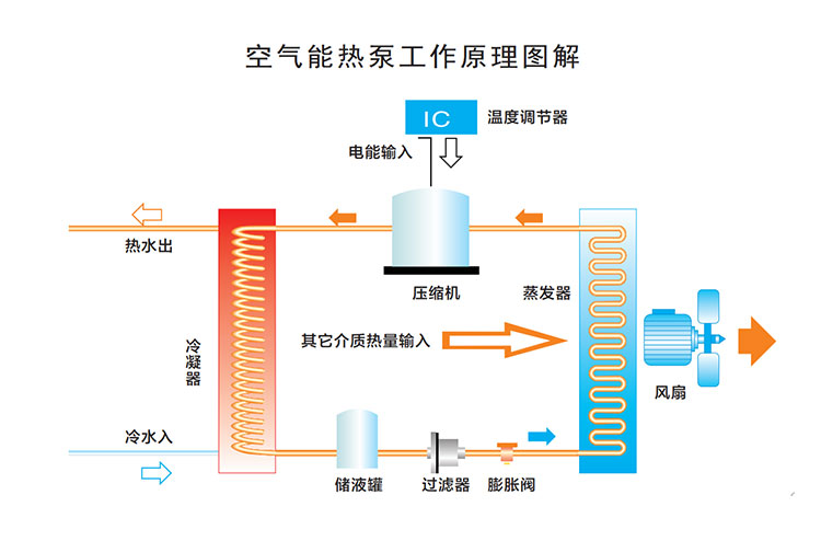 空氣能熱泵是按照“逆卡諾”原理工作的,逆卡諾循環(huán)原理。通過壓縮機系統(tǒng)運轉(zhuǎn)工作,吸收空氣中熱量制造熱水。具體過程是:壓縮機將冷媒壓縮,壓縮后溫度升高地冷媒,經(jīng)過水箱中的冷凝器制造熱水,熱交換后的冷媒回到壓縮機進行下一循環(huán),在這一過程中,空氣熱量通過蒸發(fā)器被吸收導(dǎo)入冷媒中,冷媒再導(dǎo)入水中,產(chǎn)生熱水。